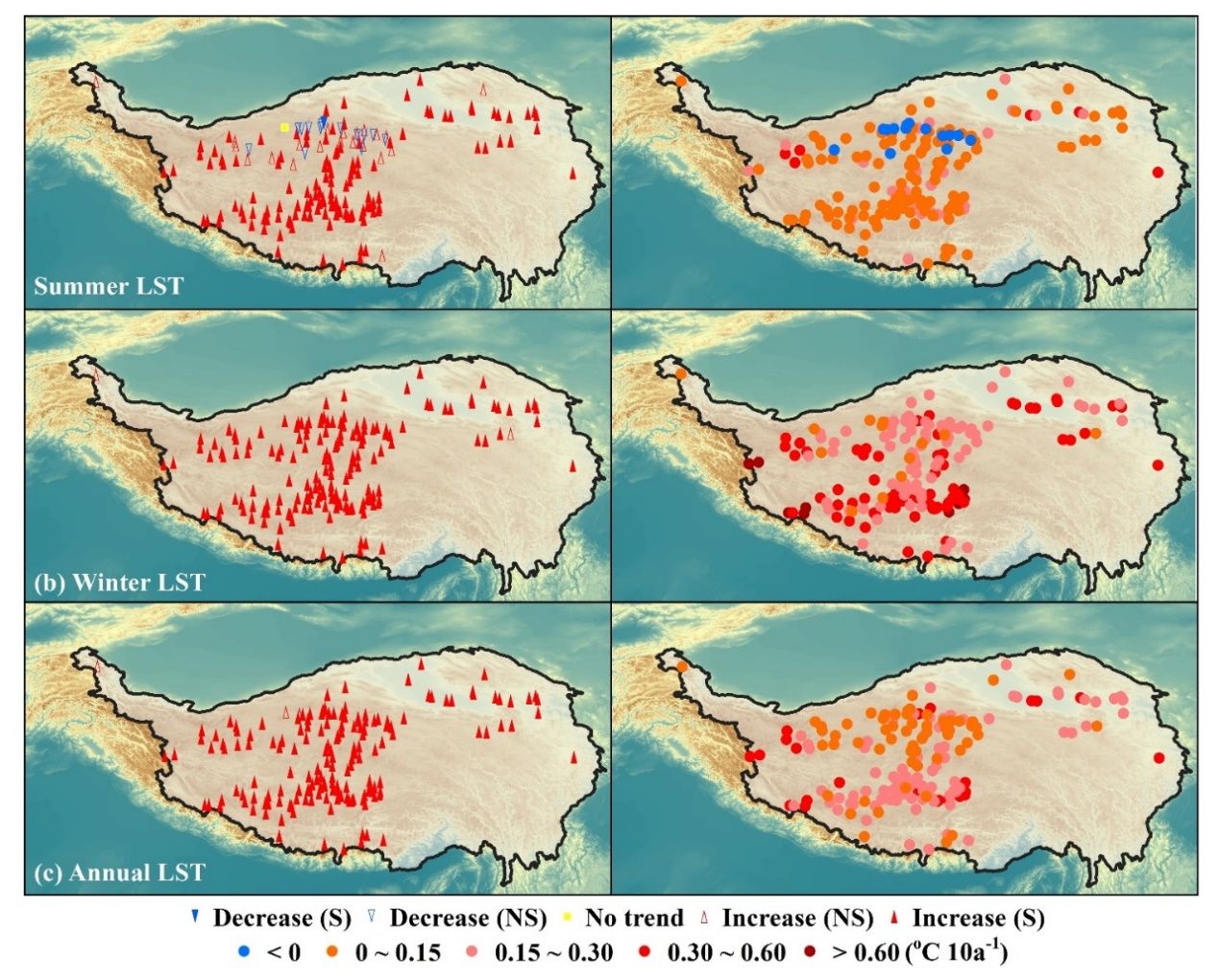 基于重建的湖面溫度時間序列,團(tuán)隊(duì)揭示了青藏高原湖面溫度的時空演化規(guī)律。研究發(fā)現(xiàn),近40年來(1978—2017年)青藏高原絕大多數(shù)湖泊的表面溫度均呈上升趨勢,升溫速率約每10年0.01~0.47℃,且冬季升溫比夏季更顯著,南部湖泊升溫速率高于北部湖泊。此項(xiàng)研究成果對于未來進(jìn)一步評估氣候變化對青藏高原湖泊水熱收支變化的影響具有重要價值。