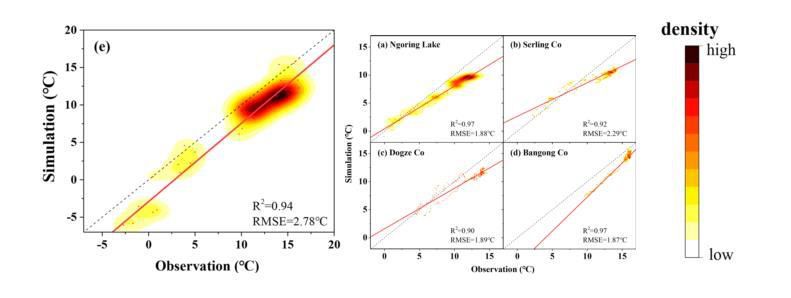 湖泊水溫是區(qū)域水分與能量平衡的重要變量,也是湖泊水生生態(tài)系統(tǒng)的控制性參數(shù)。由于常規(guī)地面觀測的局限,青藏高原湖泊水溫觀測數(shù)據(jù)普遍缺乏。團(tuán)隊(duì)集成遙感與數(shù)值模擬技術(shù),發(fā)展了水溫?cái)?shù)據(jù)重建的技術(shù)框架,突破了模型數(shù)據(jù)要求高而移植性差的局限,實(shí)現(xiàn)了多相態(tài)(冰、水、冰水混合)下湖泊水溫的動態(tài)模擬,揭示了青藏高原湖泊水溫的時空演化規(guī)律及其對氣候變化的響應(yīng)。