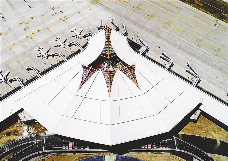 基礎(chǔ)設(shè)施更加完善,西藏民航航線擴(kuò)展到152條,通航城市發(fā)展到68個,進(jìn)出港航班日均219架次,2021年旅客吞吐量達(dá)603萬余人次。圖為西藏自治區(qū)拉薩市貢嘎國際機(jī)場T3航站樓一角。