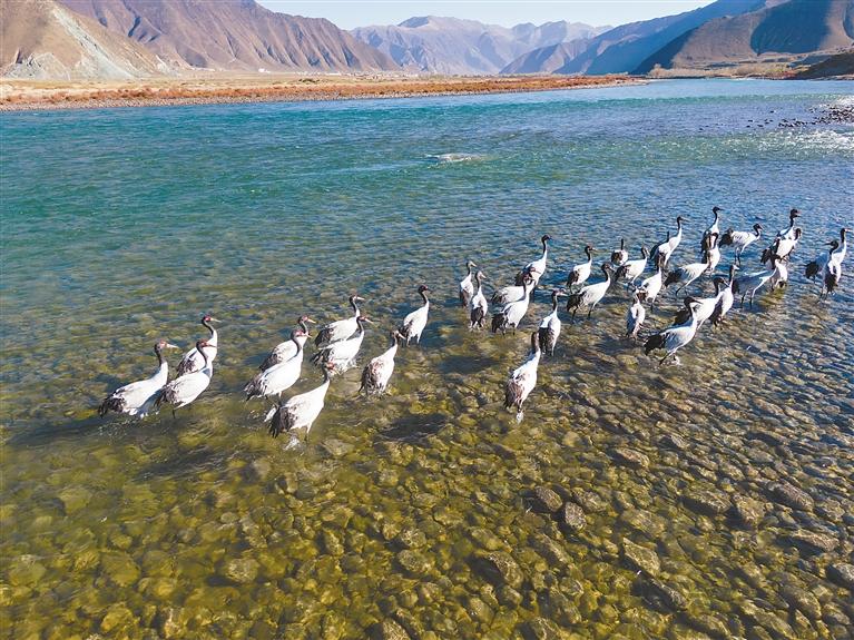 隨著西藏不斷加大黑頸鶴棲息地保護(hù)力度,黑頸鶴的生存環(huán)境進(jìn)一步改善。每年十月中下旬,大批“高原精靈”——黑頸鶴從藏北高原飛到拉薩河谷,它們在農(nóng)田、沼澤地里覓食嬉戲,享受冬日暖陽。