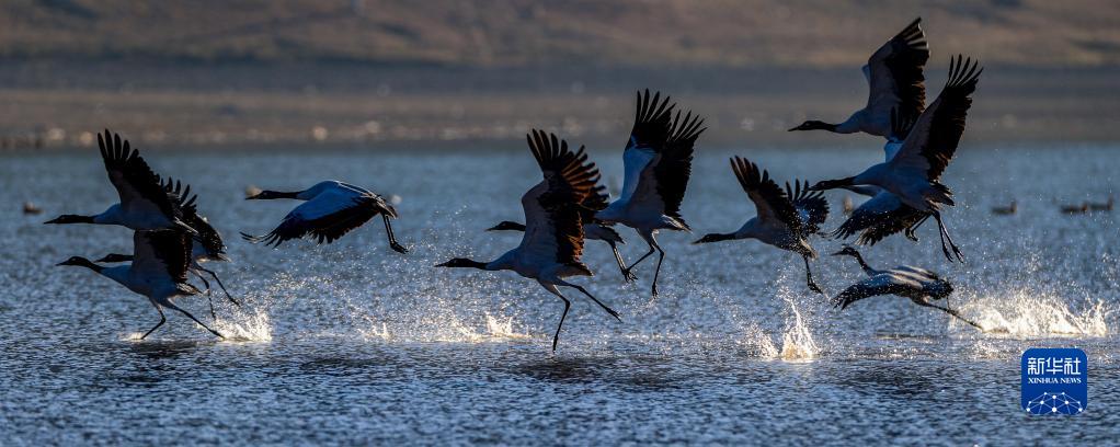 黑頸鶴在林周縣虎頭山水庫上空飛翔(11月6日攝)。新華社記者 呂秋平 攝