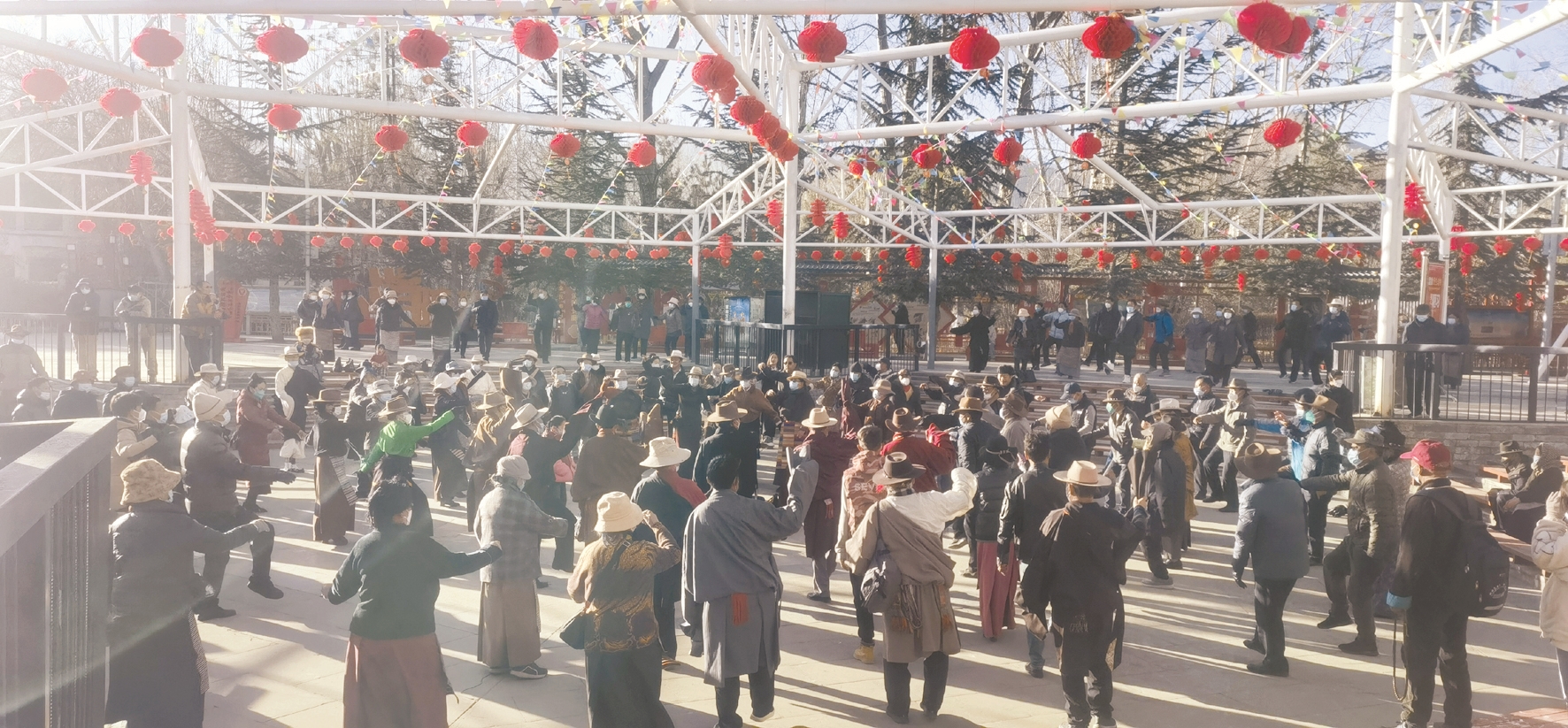 宗角祿康公園是市民群眾戶外活動的重要場所,近年來,為豐富群眾精神文化生活,拉薩市大力倡導(dǎo)全民健身,不斷完善公園健身器材,這里已成為市民每天進行晨練和休閑的首選之地。一大早,記者來到該公園看到,藏歷新年臨近,公園內(nèi)到處掛起了紅紅火火的燈籠,讓公園換上了“新裝”,在陽光的照射下,鮮艷奪目,喜氣洋洋,與公園風(fēng)景交相輝映,形成一道道靚麗的風(fēng)景線。市民們不約而同地來到這里開展健身操、鍋莊、現(xiàn)代舞等健身活動。