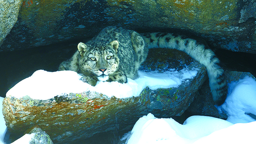 2月14日在三江源國家級自然保護區(qū)年保玉則保護分區(qū)內(nèi)拍攝到的成年雪豹。華卡加 攝