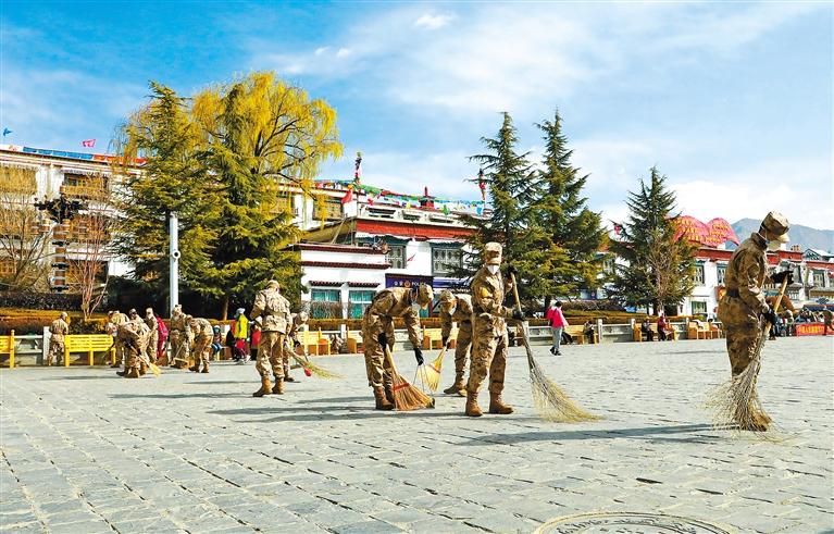 圖為拉薩警備區(qū)某團官兵在大昭寺廣場清掃路面。記者 唐斌 通訊員 何琪 攝