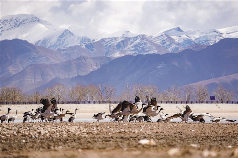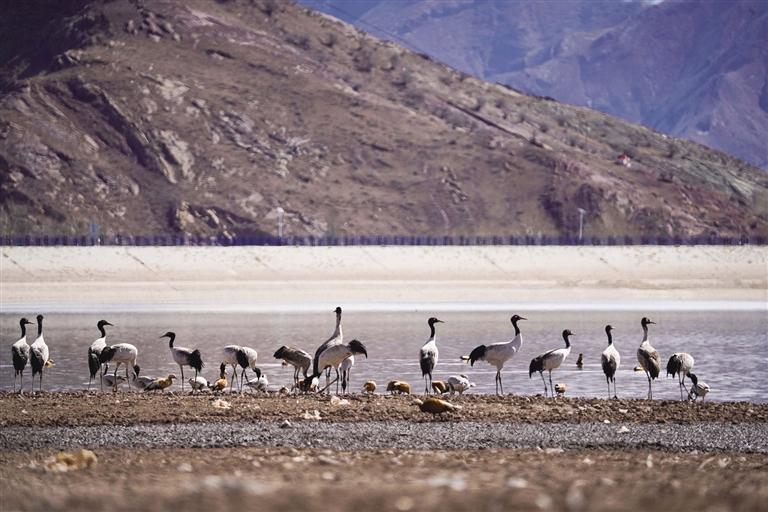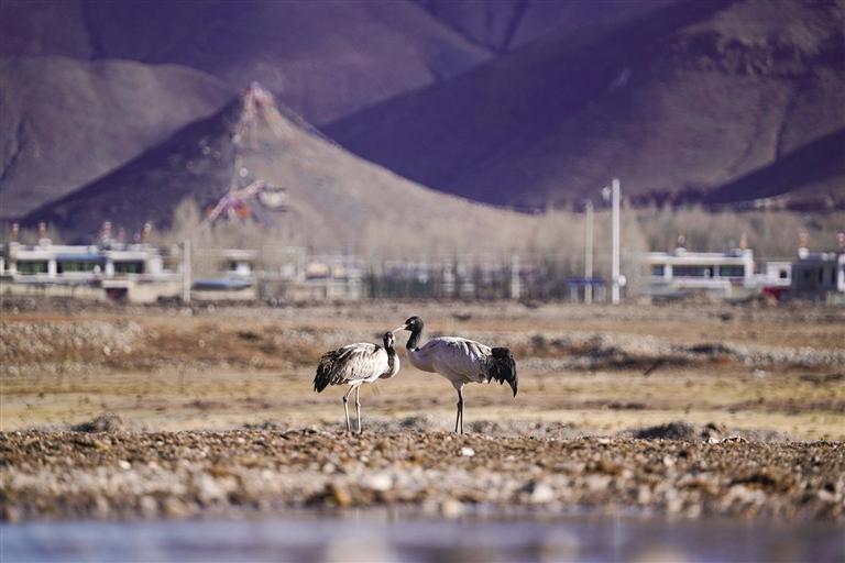 黑頸鶴是國家一級保護動物,在藏語中稱為“沖沖”。主要棲息在海拔2500米至5000米的高原、草甸、沼澤地帶。拉薩北部的林周縣平均海拔約4200米,是黑頸鶴的主要越冬地之一。最近這段時間,對拉薩市林周縣野保員們來說,一邊要忙自家的農活,一邊還要巡查候鳥情況?!耙呀浻幸恍〔糠诛w走了,估計再過半個月都會陸續(xù)飛走?!?月23日上午,野保員旦增告訴記者,在虎頭山水庫和卡孜水庫越冬的候鳥有一部分已經飛走了。野保員口中的“飛走”便是遷徙,遷徙是候鳥的本能,一年一年,跟隨時間的召喚,完成兩次遷徙:繁殖和越冬。