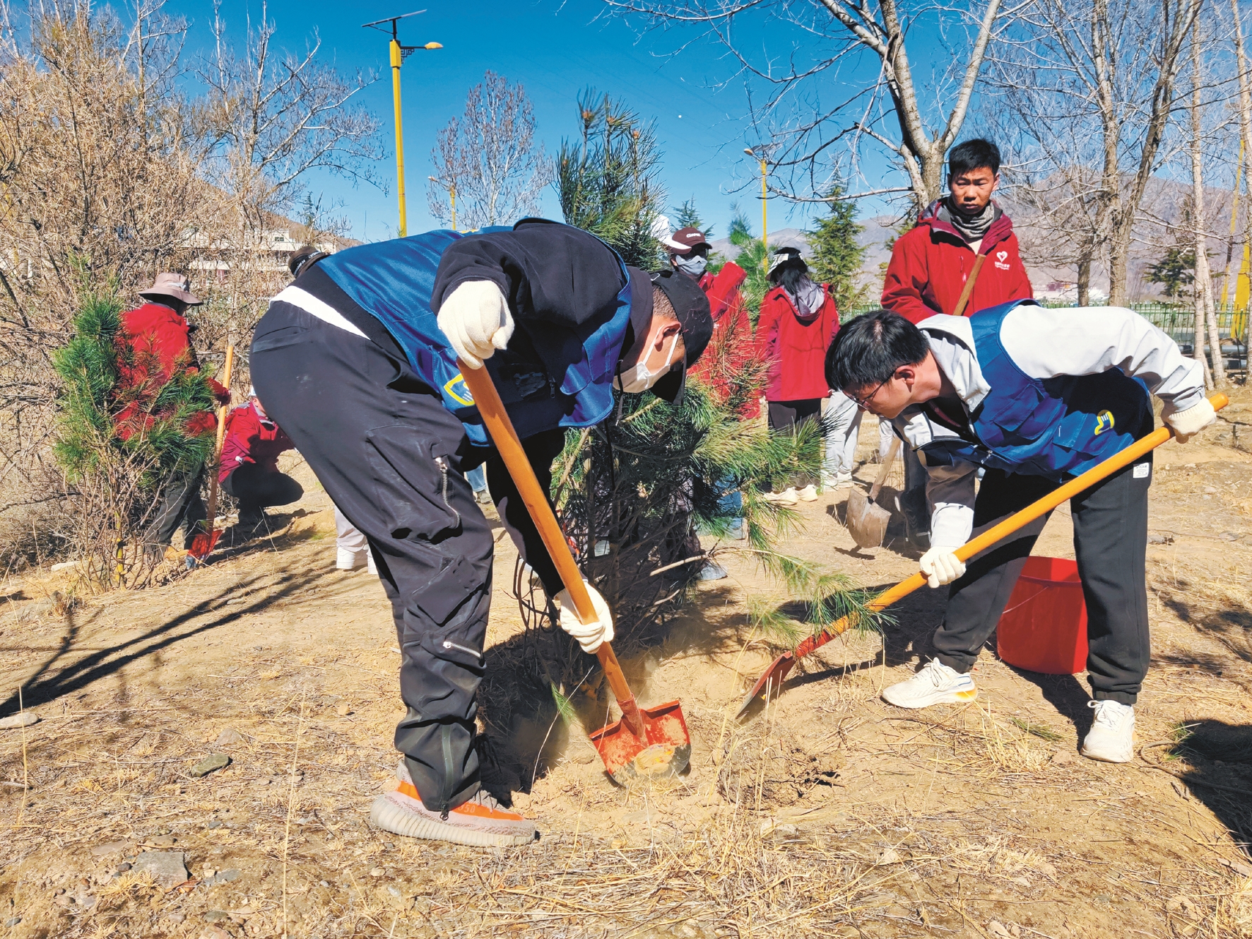 現(xiàn)場,志愿者手拿垃圾桶、夾子等工具,認真清理地面上的垃圾。隨后,不同團體志愿者被劃分為7個組開始植樹,大家干勁十足、配合默契,一起立苗、填土、澆水,有條不紊完成每道工序,并給每棵樹系上絲帶。經(jīng)過一番熱火朝天的勞動,一棵棵新栽下的樹苗昂然挺立,為初春的山坡增添了一片新綠。活動間隙,大家相互交流,憧憬著多年后荒灘變青山的場景。
