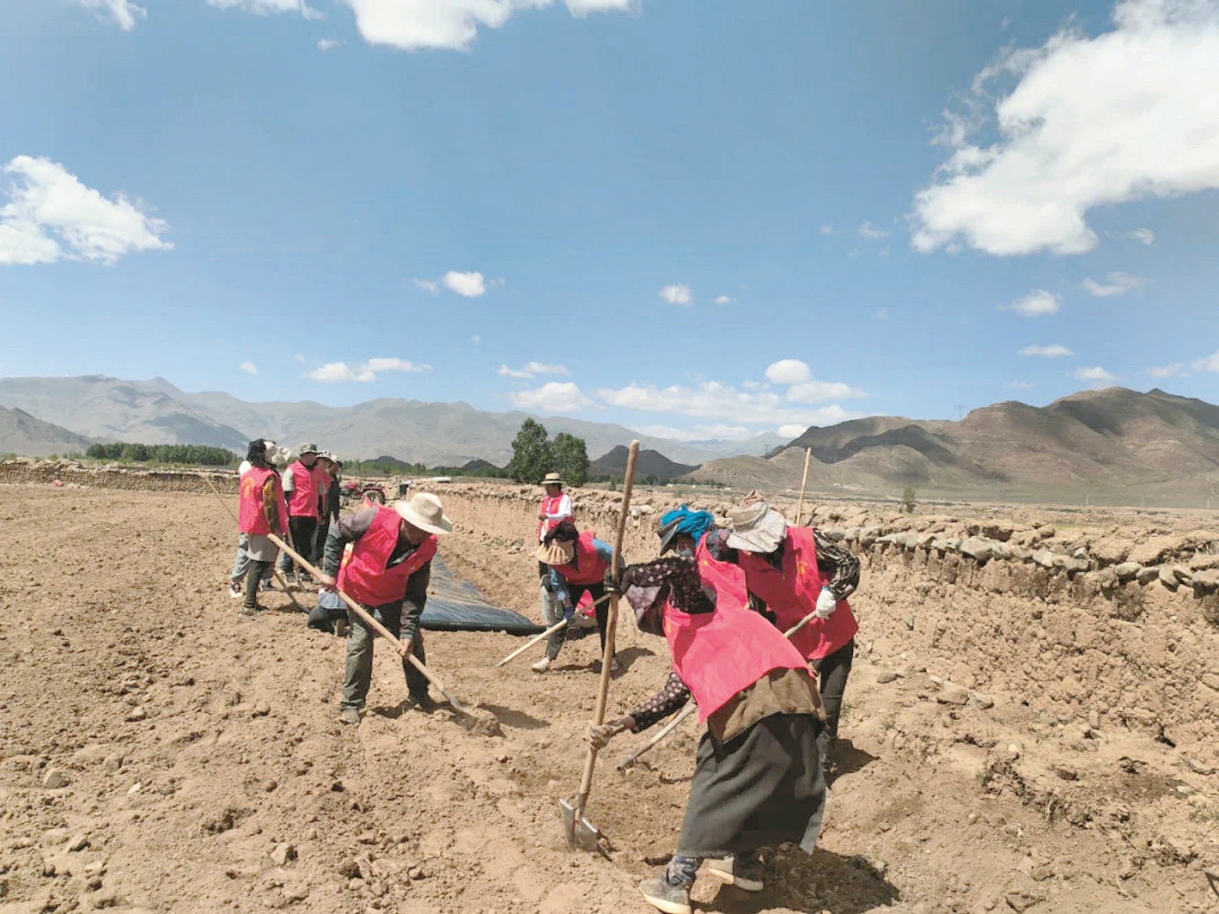 圖為志愿者們正在田間地頭幫群眾平整土地、覆土等作業(yè)。拉薩融媒記者 次仁卓嘎攝