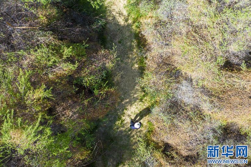 6月8日,索朗拉杰在沙棘林里(無(wú)人機(jī)照片)。新華網(wǎng) 旦增努布 攝