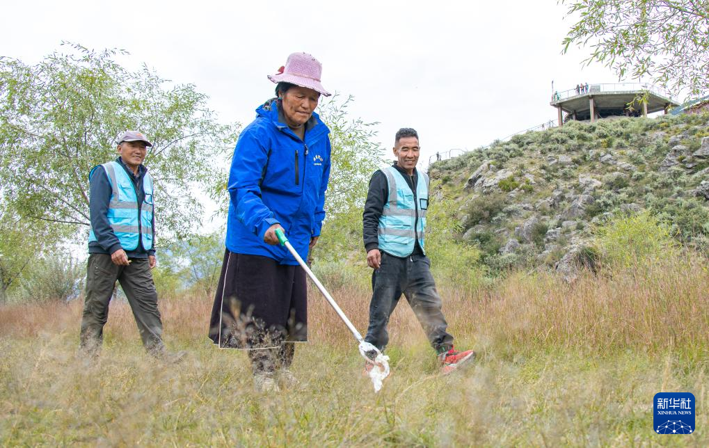 雅尼國(guó)家濕地公園管護(hù)員普布多杰(左)在巡護(hù)途中清理垃圾(9月8日攝)。新華社發(fā)(丁增尼達(dá) 攝)