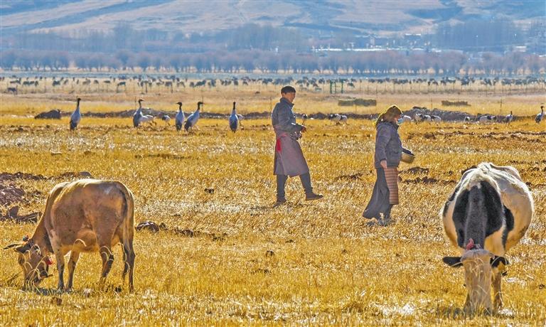 卡孜濕地是其中一個投食點(diǎn)。現(xiàn)年43歲的洛桑次旦就住在附近,每天一大早,他都會到卡孜濕地放牧?!啊従印絹碓蕉嗔耍畮啄甑臅r間,黑頸鶴的數(shù)量從幾只增長到幾百只?!甭迳4蔚└嬖V記者,黑頸鶴和牛各吃各的,互不干擾,非常和諧。