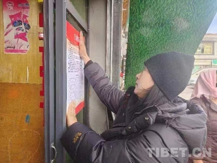 圖為郝如村駐村工作人員在街邊店鋪張貼宣傳海報(bào)