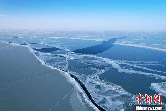 圖為航拍青海湖冰面裂縫。薛蒂攝