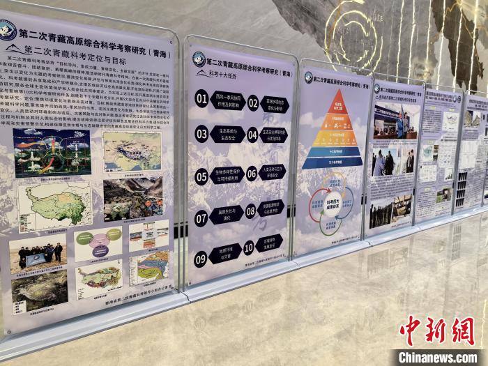 圖為第二次青藏科考成果助推青海交通高質(zhì)量發(fā)展對(duì)接會(huì)場(chǎng)外展板,展示科考項(xiàng)目?!∑钤鲚頂z