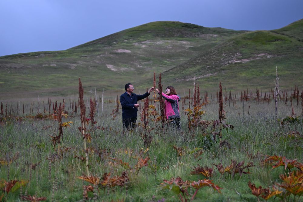 2023年9月5日,科技工作者在青海省果洛藏族自治州一處“草藥間種”的黑土灘治理試驗田中收集唐古特大黃種子。新華社記者 張龍 攝
