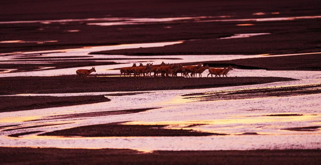 6月13日傍晚,在羌塘國家級自然保護(hù)區(qū),遷徙中的母藏羚羊越過甜水河。