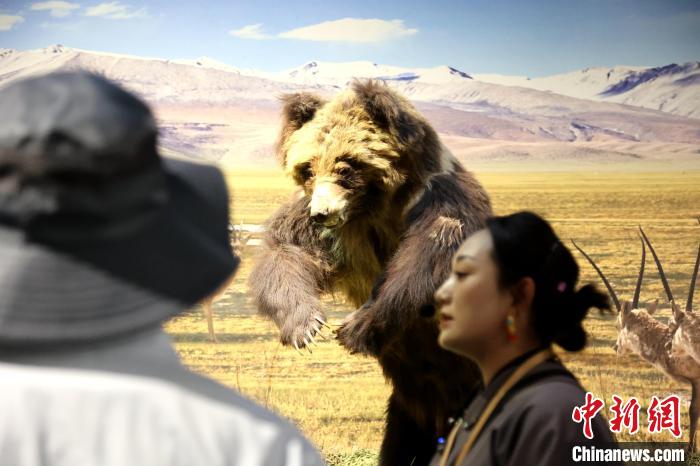 7月24日,參加“中國(guó)式現(xiàn)代化的萬(wàn)千氣象·網(wǎng)絡(luò)名人青海行”活動(dòng)的網(wǎng)絡(luò)名人,抵達(dá)江河源頭青海玉樹(shù)藏族自治州,在玉樹(shù)州博物館一覽自然與人文之美。玉樹(shù)州博物館是玉樹(shù)地震災(zāi)后重建十大標(biāo)志性建筑之一,分為序廳、自然展區(qū)、人文展區(qū)、臨時(shí)展廳。其通過(guò)實(shí)物標(biāo)本等方式,展示了三江源和可可西里的野生動(dòng)物、草地、森林,以及玉樹(shù)州的歷史、建筑、服飾、飲食等。圖為工作人員介紹棕熊等野生動(dòng)物分布情況。中新社記者 張?zhí)砀?攝