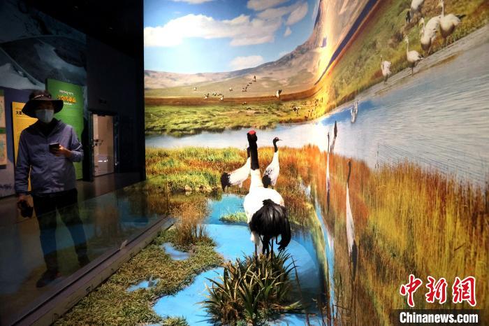 7月24日,參加“中國(guó)式現(xiàn)代化的萬(wàn)千氣象·網(wǎng)絡(luò)名人青海行”活動(dòng)的網(wǎng)絡(luò)名人,抵達(dá)江河源頭青海玉樹(shù)藏族自治州,在玉樹(shù)州博物館一覽自然與人文之美。玉樹(shù)州博物館是玉樹(shù)地震災(zāi)后重建十大標(biāo)志性建筑之一,分為序廳、自然展區(qū)、人文展區(qū)、臨時(shí)展廳。其通過(guò)實(shí)物標(biāo)本等方式,展示了三江源和可可西里的野生動(dòng)物、草地、森林,以及玉樹(shù)州的歷史、建筑、服飾、飲食等。圖為玉樹(shù)州博物館展示的黑頸鶴棲息環(huán)境。中新社記者 張?zhí)砀?攝