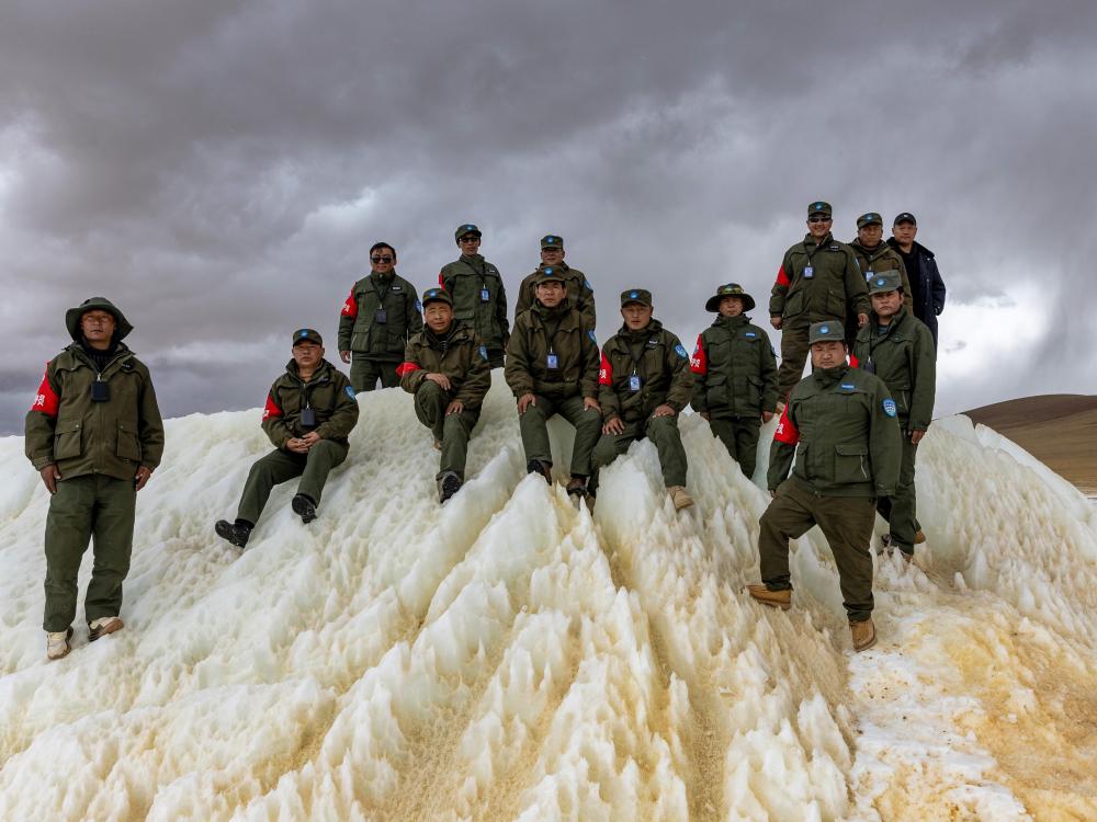 2024年5月7日,在西藏羌塘國家級(jí)自然保護(hù)區(qū),野生動(dòng)物專業(yè)管護(hù)隊(duì)員在巡護(hù)路上一處埡口的冰雪堆上合影。