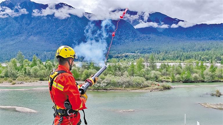 圖為波密縣森林消防中隊(duì)隊(duì)員在用拋繩器拋繩。記者 張宇 攝