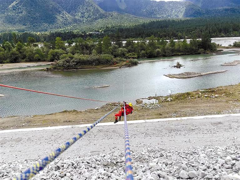 圖為波密縣森林消防中隊(duì)隊(duì)員開展橫渡孤島轉(zhuǎn)移救援演練。記者 張宇 攝