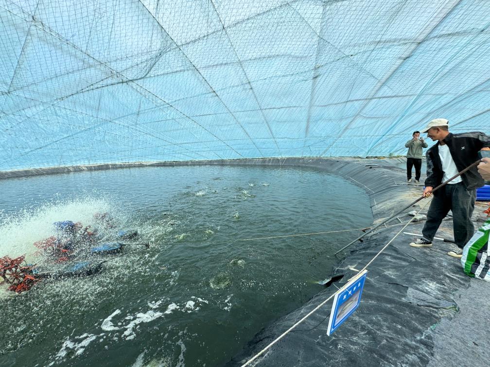 養(yǎng)殖基地的職工正在進行捕撈。新華社記者沈曉朦 攝