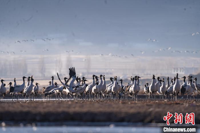 11月27日晨,西藏自治區(qū)拉薩市林周縣黑頸鶴保護(hù)區(qū)內(nèi),大量越冬的黑頸鶴在虎頭山水庫覓食、嬉戲。林周縣位于拉薩河上游及澎波河流域,平均海拔約4200米,是黑頸鶴的主要越冬地之一。中新社記者 貢嘎來松 攝
