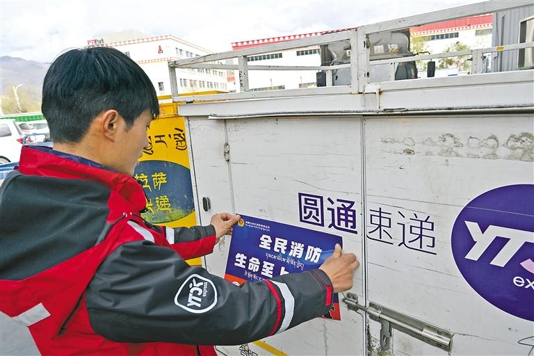 志愿者在快遞車上張貼消防宣傳海報。 郎永庫 李鑫舞 攝