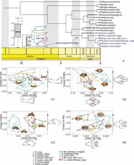 江左其杲指出,結(jié)合DNA序列和形態(tài)學(xué)數(shù)據(jù),研究團(tuán)隊(duì)推斷豹屬的系統(tǒng)發(fā)育,支持5例化石記錄的確屬于現(xiàn)生雪豹支系,且它們相對現(xiàn)生雪豹組成并系群,表明這些青藏高原之外的雪豹并非獨(dú)立于現(xiàn)生雪豹的一個(gè)分支,而是不斷從雪豹主干上分出的小分支,說明它們很有可能代表雪豹多次在特定時(shí)間段走出青藏高原的記錄,而這些記錄共同組成了雪豹演化的幾個(gè)斷面,從而得以揭秘雪豹如何一步步特化。