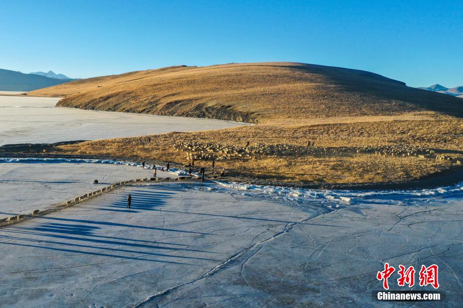 2月7日,西藏山南市浪卡子縣推瓦村1000多只羊通過(guò)普莫雍錯(cuò)冰湖,前往湖心島。據(jù)悉,位于西藏山南市浪卡子縣的推瓦村,平均海拔約5070米,是世界上海拔最高的行政村,以牧業(yè)為主。由于推瓦村海拔高、夏季短,草場(chǎng)無(wú)法為羊群提供充足的過(guò)冬飼料,因此,每年高原最冷的時(shí)候,推瓦村牧民會(huì)把羊群趕到普莫雍錯(cuò)水草豐茂的湖心島,依靠島上的草料度過(guò)最寒冷的冬期。圖為羊群到達(dá)湖心島。(無(wú)人機(jī)照片)