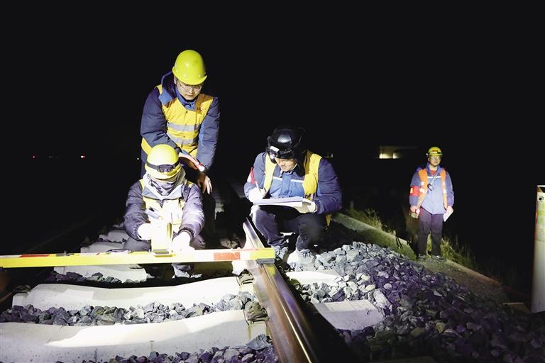 漆黑的夜晚,空曠的鐵道線上,只有測量時的對話聲和對講機里的聯(lián)控聲。4名工作人員各司其職,迎著呼嘯的冷風,借助頭燈的亮光,仔細檢查接觸網(wǎng)的各個部件,并認真測量記錄接觸網(wǎng)補償裝置等關鍵參數(shù)。