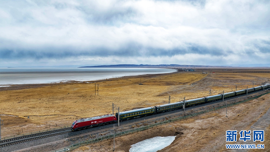 2月15日,青海湖北岸,一列火車經(jīng)過(無人機(jī)照片)。新華網(wǎng)發(fā) (宋忠勇 攝)