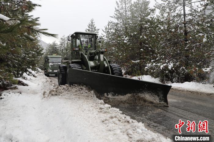 圖為武警官兵駕駛機(jī)械清除路面積雪。武警第二機(jī)動總隊(duì)某支隊(duì)供圖