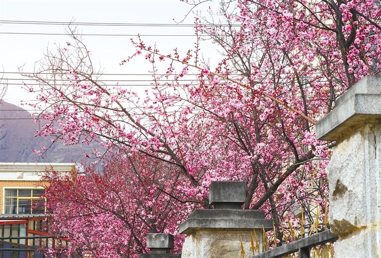 圖為拉薩市軍民路上,粉色的花朵在春日暖陽(yáng)中絢麗綻放。記者 鄭常容 攝