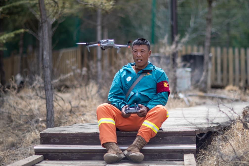 拉薩南山公園園區(qū)護林員扎西曲培正在操控無人機(3月20日攝)。新華社記者姜帆 攝