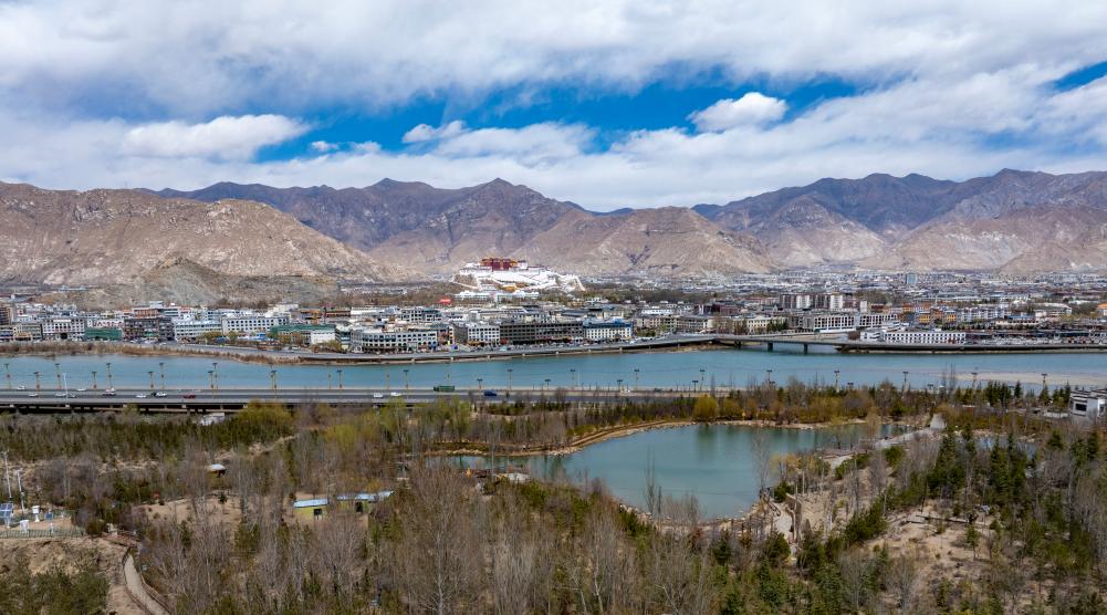 拉薩坐落于狹長的河谷地帶,拉薩河蜿蜒穿城,兩岸南山與北山連綿起伏。在布達拉宮正南方,綠色的南山與市區(qū)隔河相望,山間灌木與喬木錯落有致,綠意盎然。