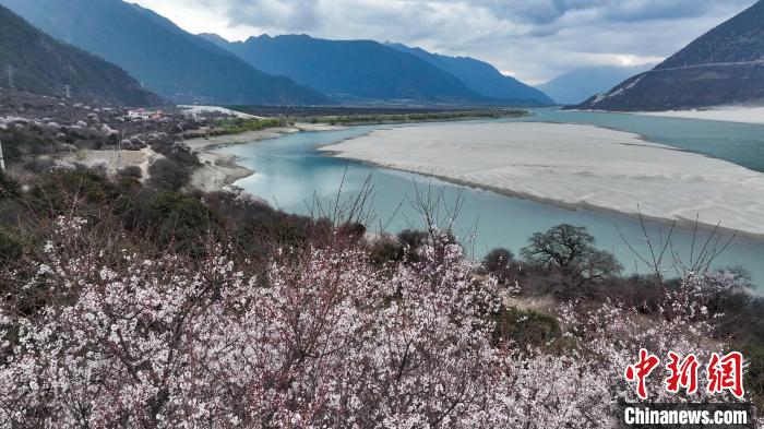 3月28日,西藏自治區(qū)林芝市,雅魯藏布江碧綠的江水與岸畔的桃花、遠(yuǎn)處的雪山相映成趣,美景如畫。中新社記者 馬銘言 攝