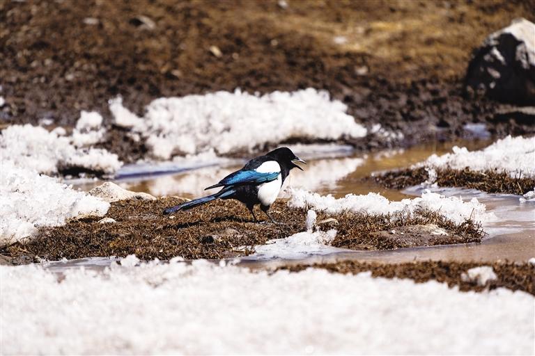 山谷內(nèi),牦牛悠然自得地吃著草,彎曲的小河縱向穿過草甸,河面還覆蓋著半邊冰殼,活水從豁口涌出,推著碎冰碴子旋轉,撞擊在冰沿上發(fā)出清脆的聲響。潺潺流水聲、牛叫聲與鳥類的鳴啼交織在一起,奏響了一曲治愈的鄉(xiāng)村小調(diào)。
