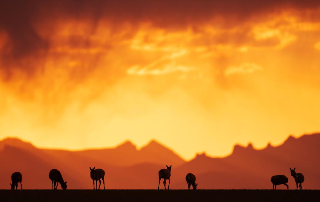 2024年6月16日,在羌塘國(guó)家級(jí)自然保護(hù)區(qū)境內(nèi)的西藏那曲市申扎縣買巴鄉(xiāng)魯確塘草原上,待產(chǎn)的藏羚羊沐浴在晚霞中。新華社記者費(fèi)茂華攝