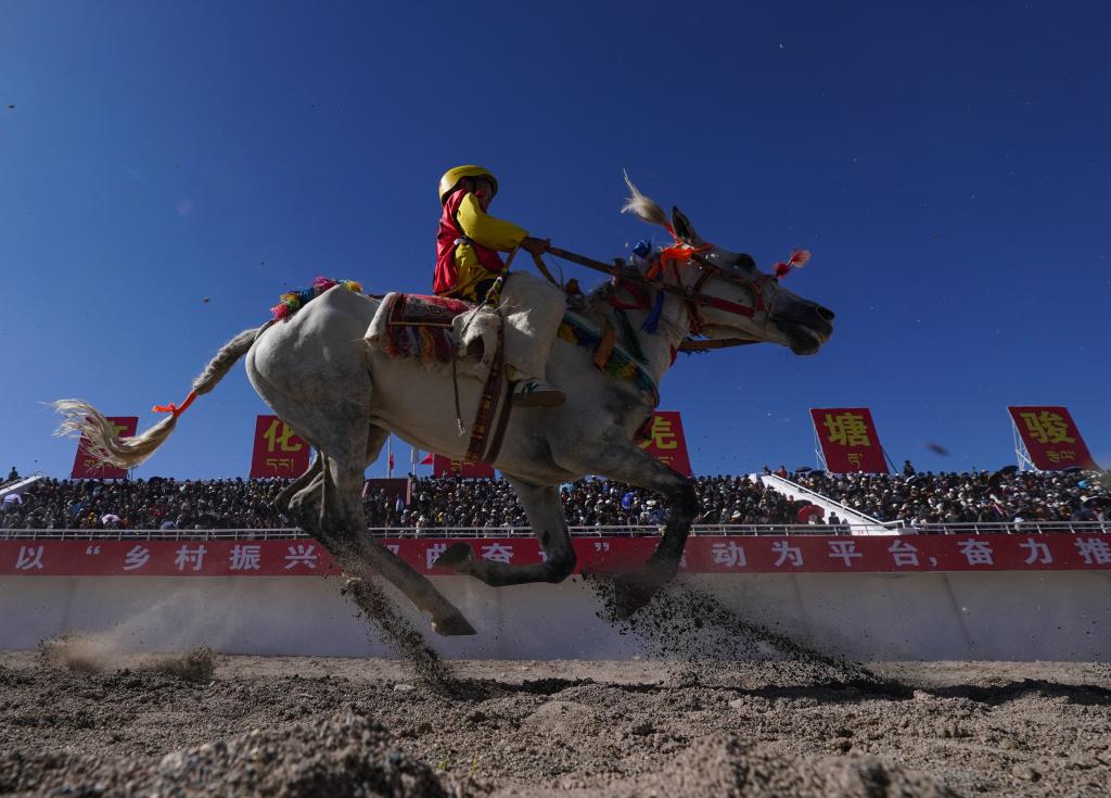 2024年8月11日,恰青賽馬節(jié)暨第三屆“鄉(xiāng)村振興那曲奮進(jìn)”活動(dòng)在西藏自治區(qū)那曲市色尼區(qū)開賽。這是選手在比賽中。新華社記者晉美多吉攝