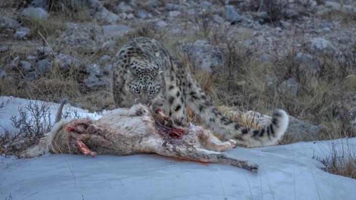 青海省玉樹藏族自治州境內(nèi),一只雪豹在捕食。 玉樹藏族自治州官方供圖