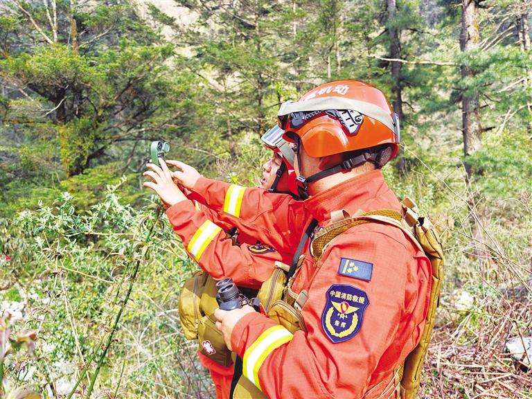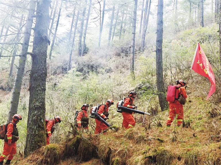 圖為消防員在植被茂密的林間巡邏。文/圖 通訊員 洛桑頓珠 記者 旦增嘎瓦
