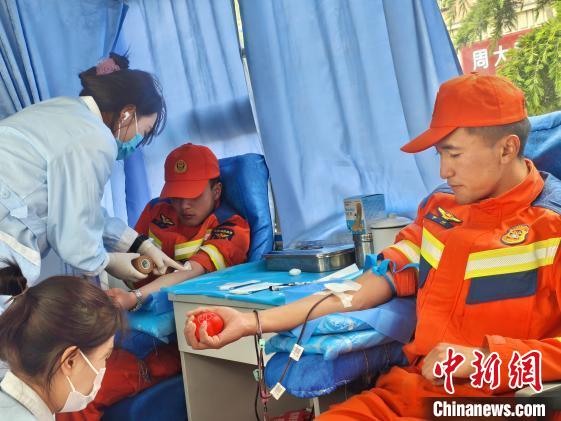 圖為日喀則市森林消防大隊(duì)指戰(zhàn)員獻(xiàn)血現(xiàn)場(chǎng)。洛桑頓珠 攝