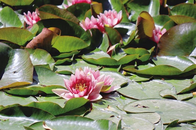 “移舟水濺差差綠,倚欄風(fēng)搖柄柄香?!弊哌M(jìn)柳梧國(guó)際總部城院內(nèi),在停車場(chǎng)的東側(cè),一池蓮花在層層蓮葉的襯托下開得正盛。走近池邊,蓮葉特殊的淡淡香味夾雜著潮濕的水汽撲面而來。粉、白的蓮花在幾場(chǎng)雨過后,迎著陽(yáng)光依次綻放。幾個(gè)孩子在池邊嬉戲追逐,時(shí)不時(shí)用手挑起水花四濺,遠(yuǎn)遠(yuǎn)看去,頗有“小姑貪戲采蓮遲”的意味。
