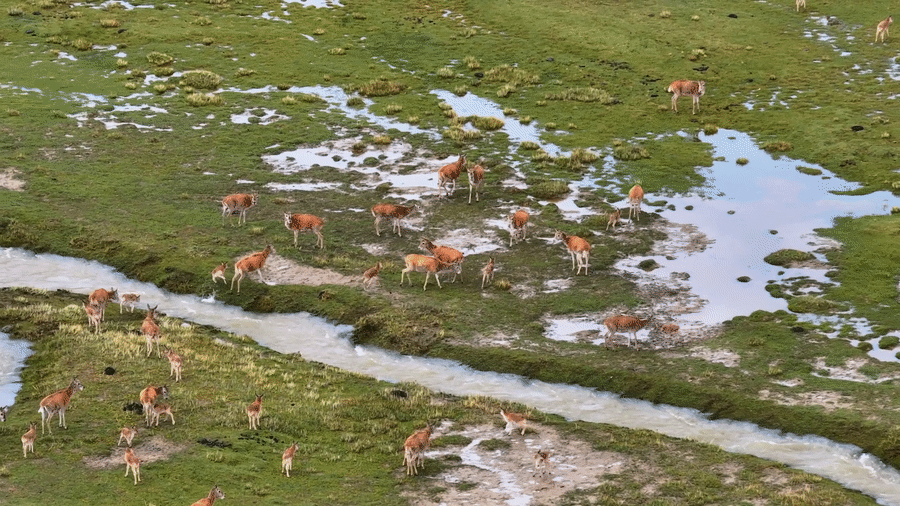 近日,藏羚羊群中,一只罕見(jiàn)的白色小藏羚羊緊隨母親,踏過(guò)河水順利抵達(dá)對(duì)岸,雪白的身影在群中格外醒目。