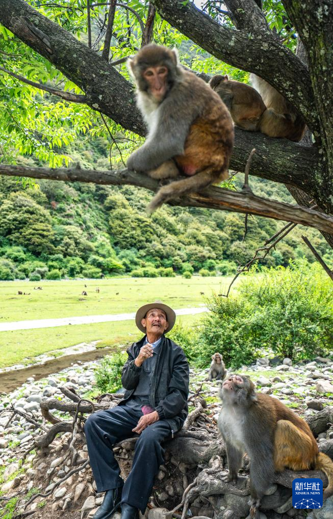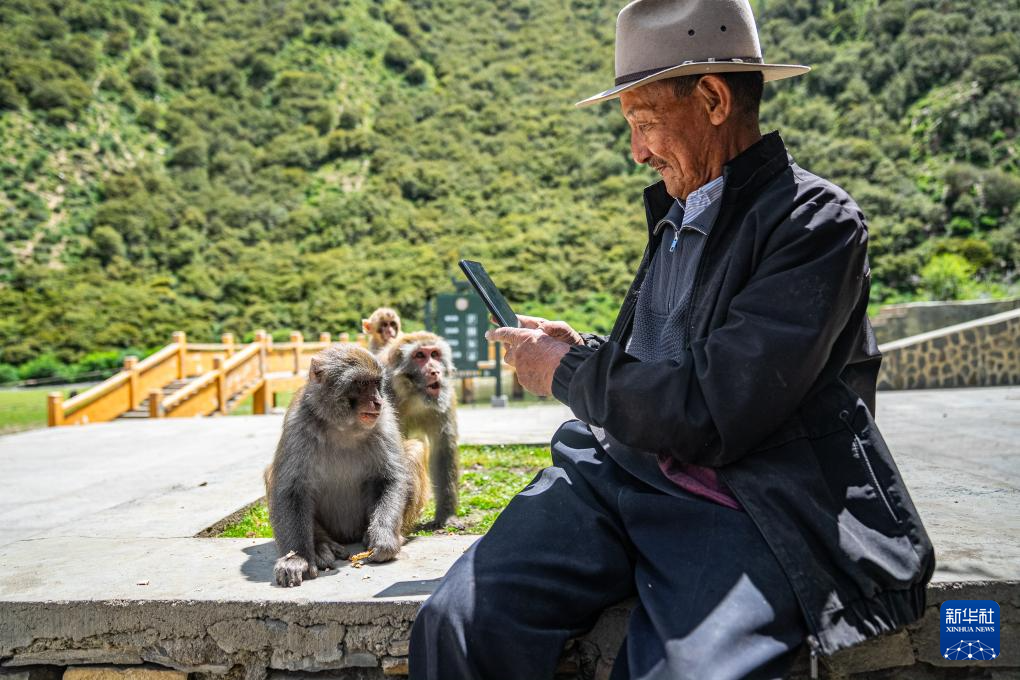 在林則生態(tài)文化旅游景區(qū),多布杰老人給藏獼猴拍照(7月23日攝)。新華社記者 丁增尼達(dá) 攝