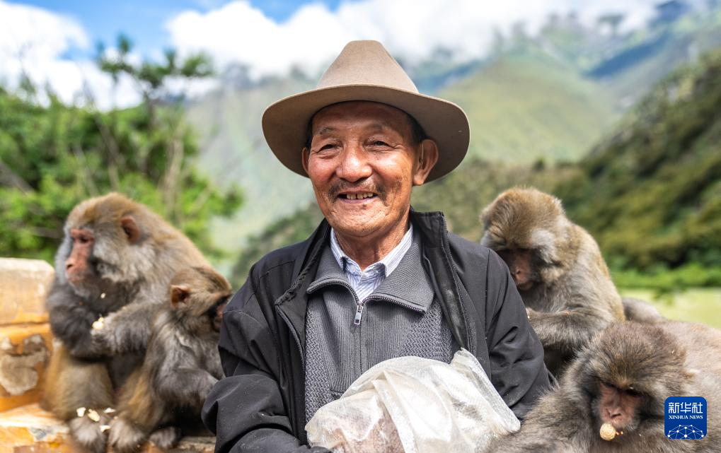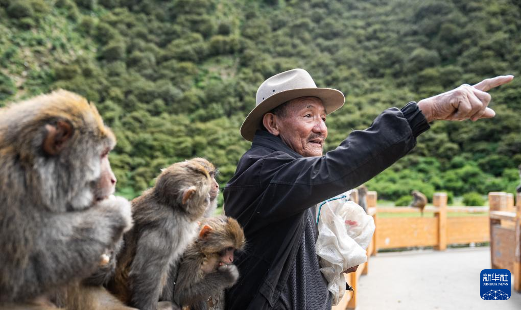 在林則生態(tài)文化旅游景區(qū),多布杰老人在給藏獼猴喂花生(7月23日攝)。新華社記者 丁增尼達(dá) 攝