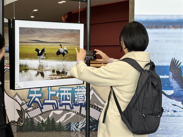 據(jù)介紹,黑頸鶴是世界上唯一一種在高原地區(qū)繁殖、生活的鶴類。近年來(lái),隨著全區(qū)生態(tài)保護(hù)力度不斷加強(qiáng),黑頸鶴種群數(shù)量穩(wěn)步增長(zhǎng)、棲息地范圍持續(xù)擴(kuò)大。今年2月,黑頸鶴當(dāng)選拉薩市鳥(niǎo)。本次巡展在首次“天上西藏·鶴鶴有鳴”主題攝影展的基礎(chǔ)上,進(jìn)一步拓展展覽內(nèi)容,豐富展覽形式,旨在以“高原精靈”黑頸鶴為媒介,積極探索“文旅+生態(tài)”融合發(fā)展的新路徑,力爭(zhēng)將“天上西藏·鶴鶴有鳴”打造成高原文旅特色品牌。未來(lái)我區(qū)將打造更多特色鮮明的觀鳥(niǎo)線路、旅游攝影點(diǎn),發(fā)展綠色旅游和“觀鳥(niǎo)經(jīng)濟(jì)”,吸引更多游客走進(jìn)西藏,領(lǐng)略西藏獨(dú)特的生態(tài)魅力和人文風(fēng)情。