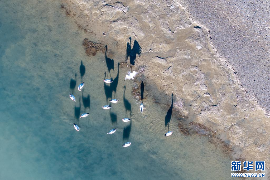 12月19日,在西藏日喀則市南木林縣的雅魯藏布江河畔拍攝的黑頸鶴(無人機照片)。新華網 旦增努布 攝