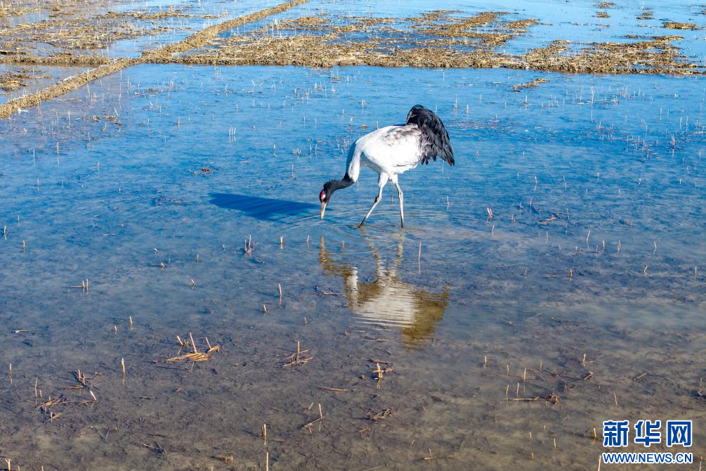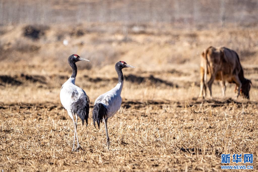 12月18日,在西藏日喀則市南木林縣田間覓食的黑頸鶴。新華網 旦增努布 攝