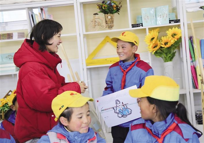 美術(shù)教室布置之初,從一年級到六年級,二三十名學(xué)生追到新教室,拿著彩筆在墻上畫出一幅幅稚嫩卻充滿童趣的圖畫?!拔蚁氘嬕粋€城堡,給它圖上美麗的顏色!”“我要把牦牛畫在墻上?!薄拔乙媯€飛行員”……